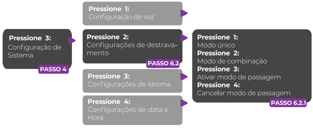 **6.3 Modo passagem:** Quando for necessário destravar a fechadura com frequência, durante uma reunião ou evento, essa configuração pode ser útil, já que as pessoas desbloqueiam a fechadura sem qualquer identificação.