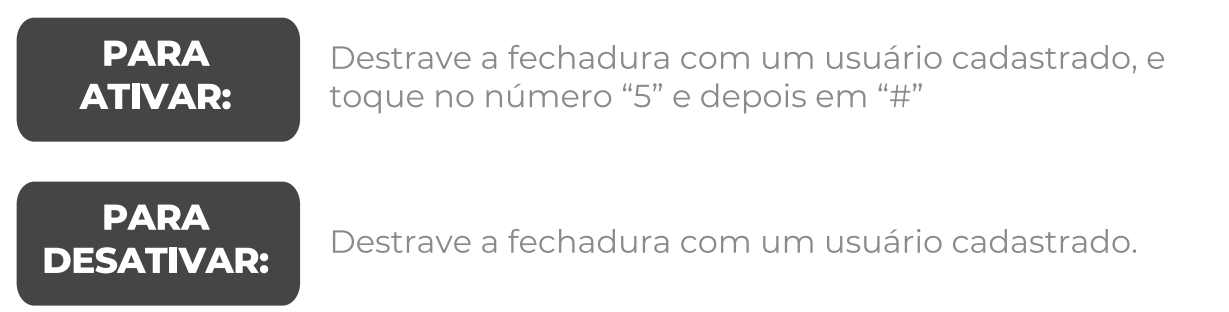 * **PARA ATIVAR:** Destrave a fechadura com um usuário cadastrado, e toque no número "5" e depois em "#".