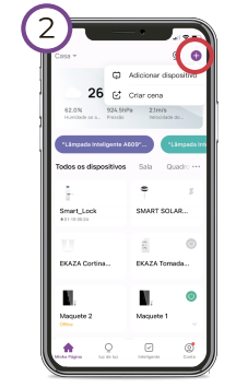 2. Em seu smartphone, abra o App EKAZA e toque no botão "+" no canto superior esquerdo. Em seguida toque em "Adicionar Dispositivo".
