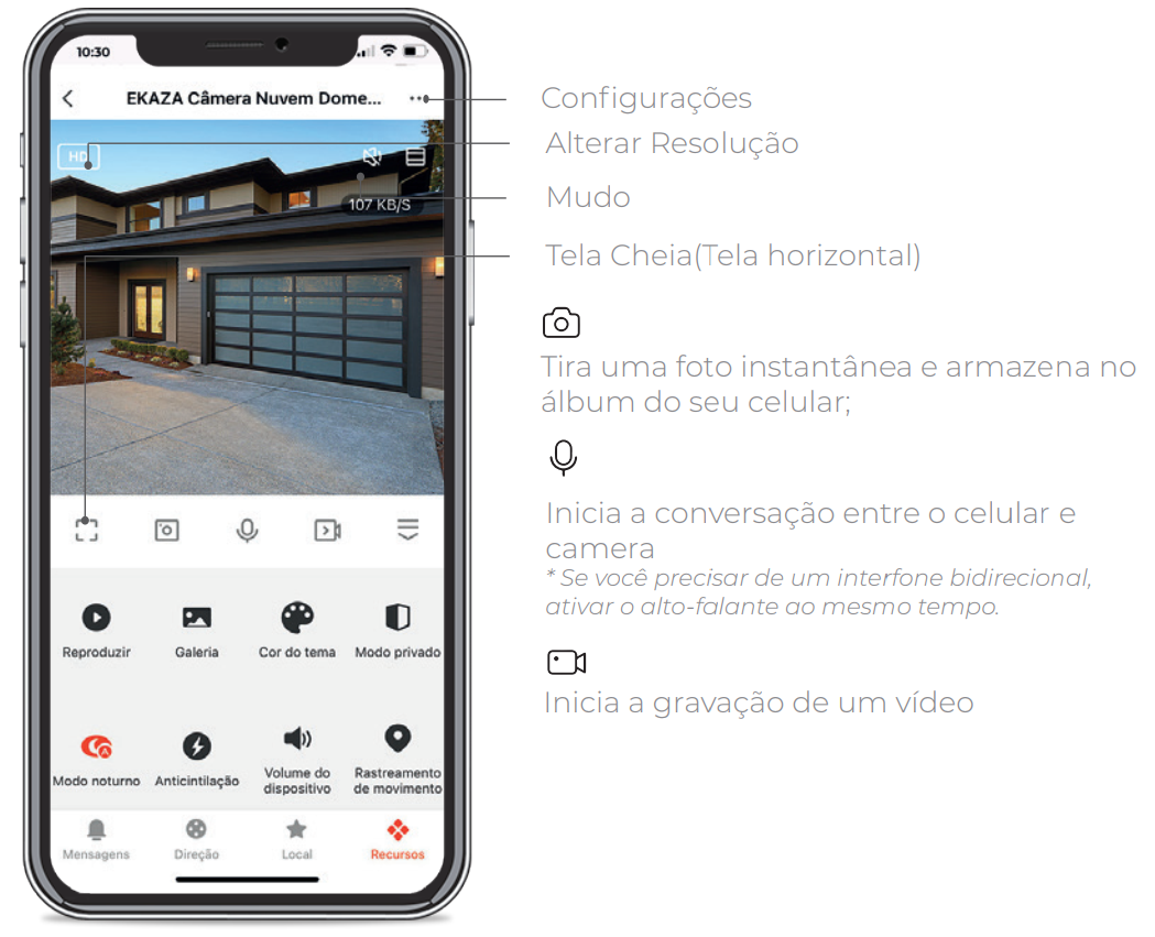 * **Falar:** Inicia a conversação entre o celular e a câmera. *Você pode precisar de um interfone bidirecional para enviar mensagens de voz.*