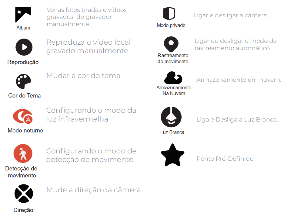 * **Cor da Luz:** Configurando o modo da luz / infravermelho. (Pode não ser aplicável a este modelo)