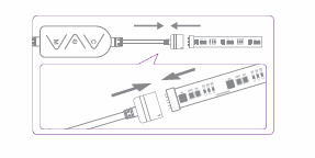 Conecte a controladora e a fita, prestando atenção à indicação de sentido, conforme figura abaixo.
