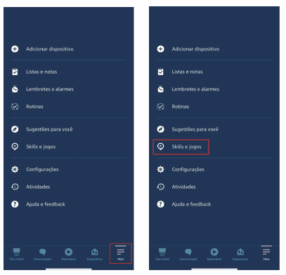 4. No canto inferior direito da Página inicial do app Alexa, clique no botão **"Mais"** para mostrar o menu. Em seguida, clique **"Skills e jogos"**.
