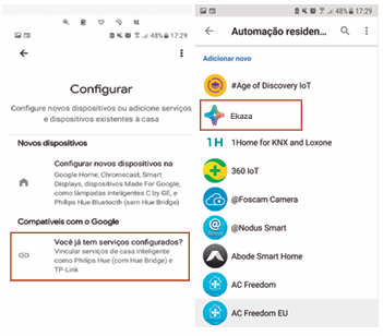 3. Selecione a página **"Configurar dispositivo"**, logo após selecione **"Já tem algo configurado?"** (ou "Funciona com o Google"). Role para baixo até encontrar **"EKAZA"** e clique nele. Faça login no EKAZA App com sua conta.