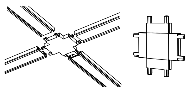 * Descrição: Permite a conexão de um trilho de teto com um trilho de parede, unindo-os e eletrificando-os.
