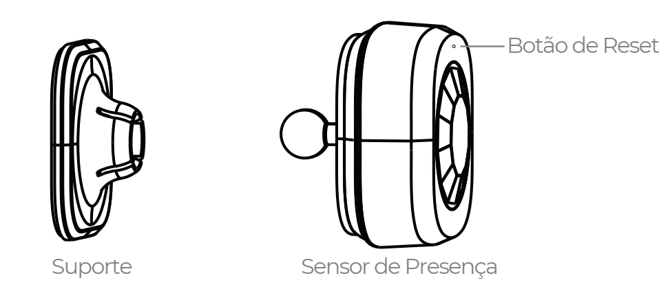 [Ilustração: Conteúdo da embalagem: Suporte (base de montagem), Sensor de Presença, e indicação do Botão de Reset (geralmente um pequeno orifício que necessita da "chave pino").]
