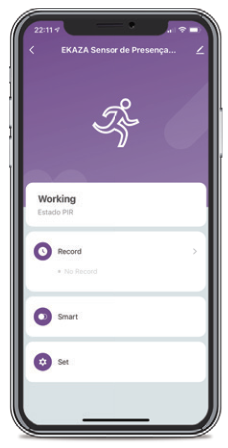 [Ilustração: Tela do aplicativo EKAZA mostrando a interface de um "EKAZA Sensor de Presença" com as seguintes opções:]