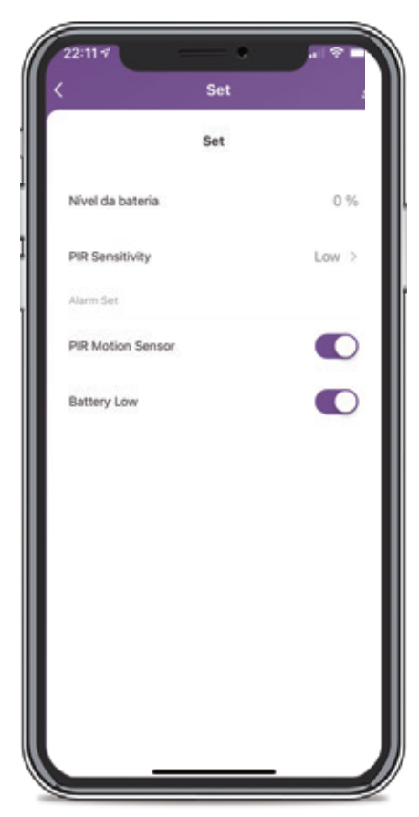 * **Sensibilidade:** Por favor, configure o nível de sensibilidade corretamente para o ambiente, um nível de sensibilidade muito alto irá acelerar o consumo da bateria.