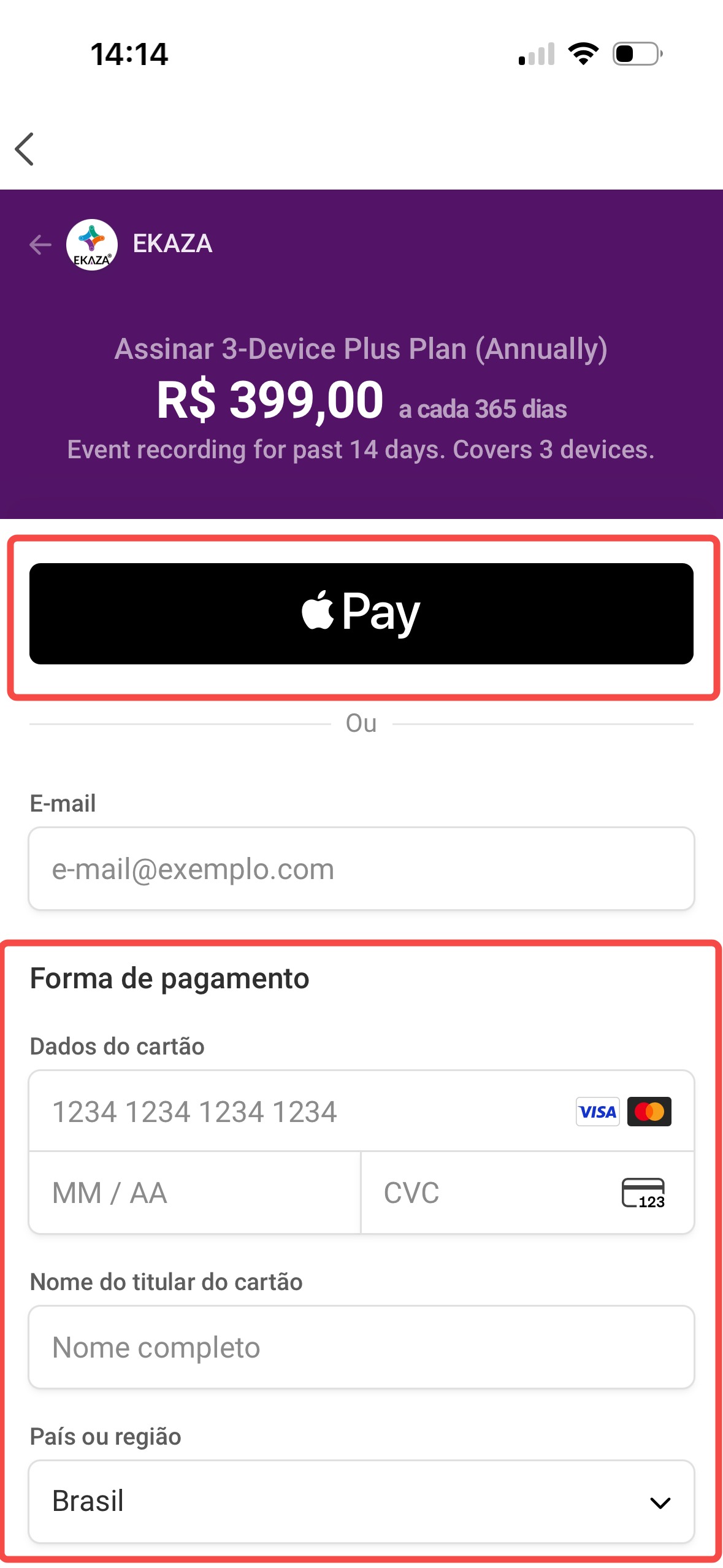 Bank Card: Insira as informações do cartão ou pague com o Apple Pay ou Android Pay