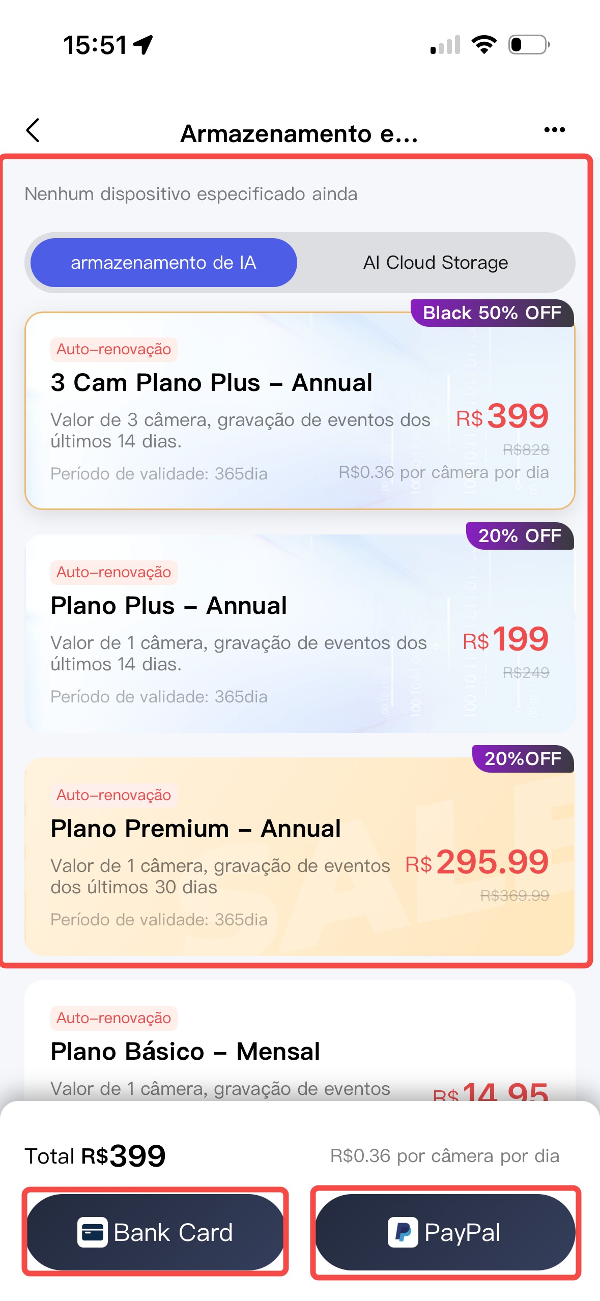 3- Escolha o plano desejavel, e a forma de pagamento Bank card ( Pagamento com o cartão de crédito ou debito ) ou com uma conta PayPal.