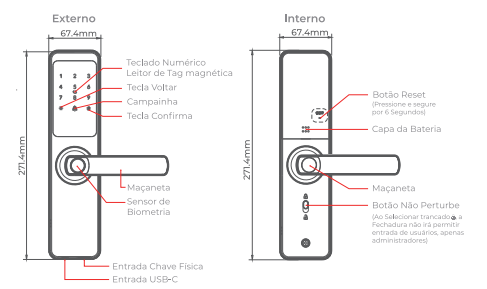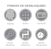 * **Formas de desbloqueios:** Digital, Senha, Tag Magnética, Chave Física, Aplicativo