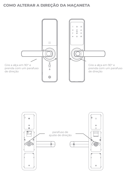 Gire a alça (maçaneta) em 90° e prenda com um parafuso de ajuste de direção para fixar a nova orientação.