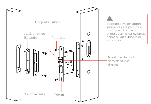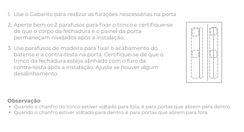 **IMPORTANTE:** Leia atentamente as instruções para que a instalação seja concluída. Siga os passos "Ajustar Maçaneta" e "Ajuste da Lingueta" se necessário.