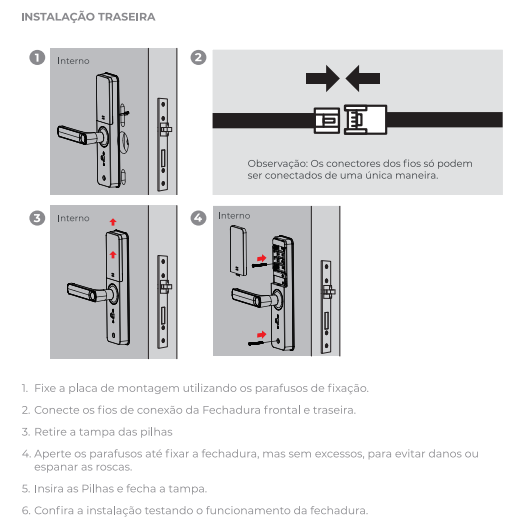 5. **Instalação Traseira:** Fixe a placa de montagem, conecte os fios, aperte os parafusos (sem excesso), insira as pilhas e feche a tampa.