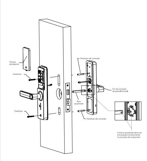 4. **Instalação Frontal:** Fixe os cilindros de conexão, posicione o eixo quadrado, passe o fio de conexão pela porta e posicione a fechadura.