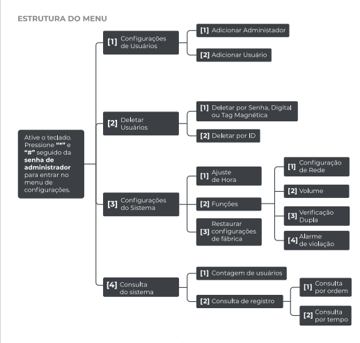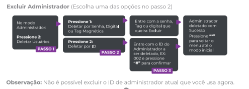 * **Pressione 1:** Deletar por Senha, Digital ou Tag Magnética (apresente o método a ser excluído).