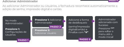 4. Cadastre o método de desbloqueio (senha de 6 dígitos, impressão digital ou tag magnética) e pressione `#` para finalizar.