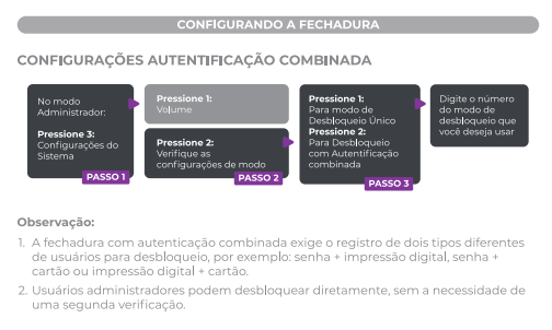 Exige o registro de dois tipos diferentes de desbloqueio (ex: senha + digital) para abrir a porta. Administradores podem desbloquear com apenas uma verificação.