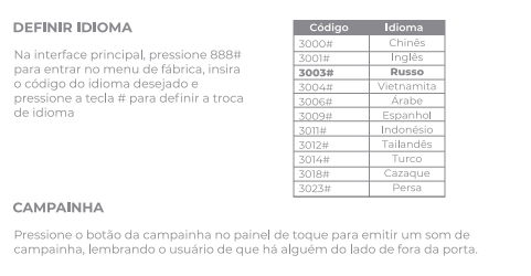 Na interface principal (teclado ativo), pressione `888#` para entrar no menu, insira o código do idioma desejado e pressione `#`.