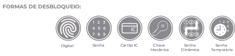 * **Desbloqueio pelo APP:** Senha de uso único, Senha Temporária (Agendar período)
