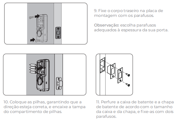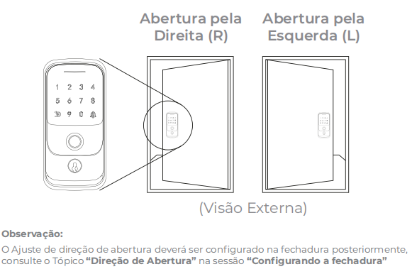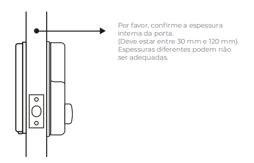 A direção de abertura (Direita/Esquerda) é configurada posteriormente via menu da fechadura. Consulte a seção "Configurando a fechadura". Verifique se a espessura da sua porta está entre 30 mm e 120 mm.