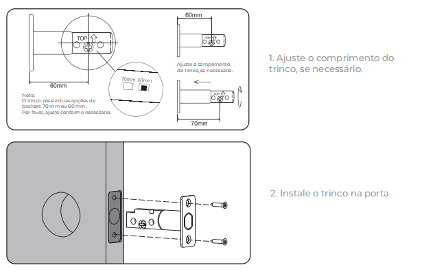 1. Ajuste o comprimento do trinco (backset) para 60mm ou 70mm, se necessário.
