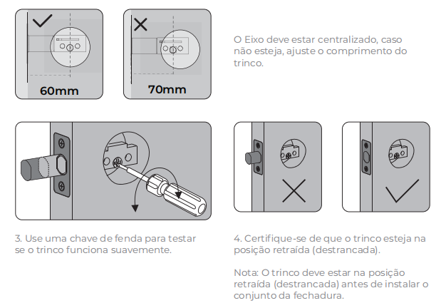 4. Certifique-se de que o eixo do trinco esteja centralizado e na posição retraída (destrancada) antes de continuar.