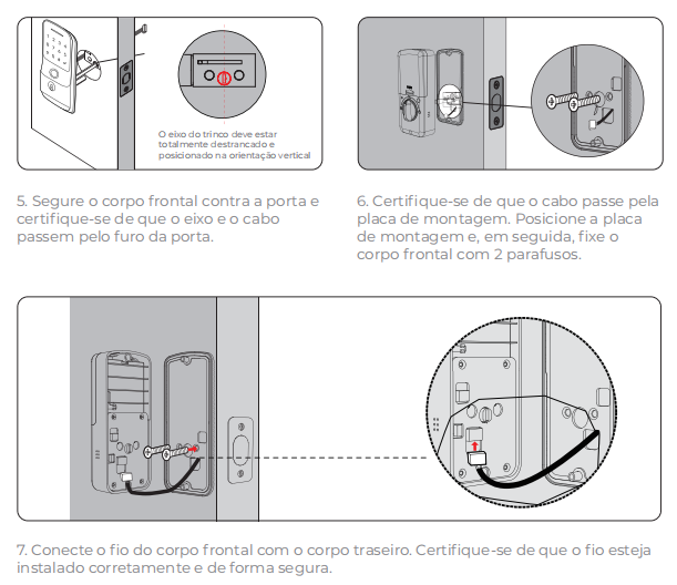 1. Segure o corpo frontal contra a porta, passando o eixo e o cabo pelo furo.