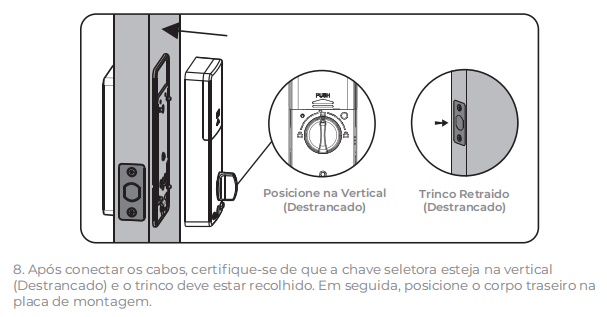 4. Certifique-se de que a chave seletora interna esteja na vertical (Destrancado) e o trinco recolhido. Posicione o corpo traseiro na placa de montagem.