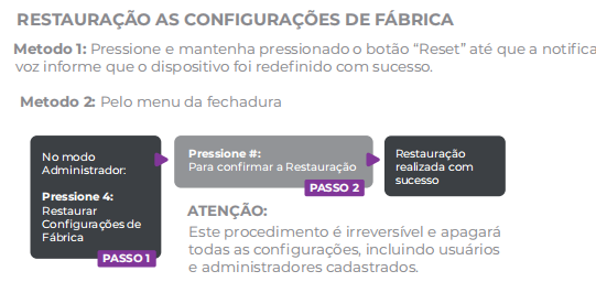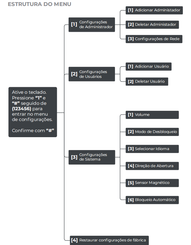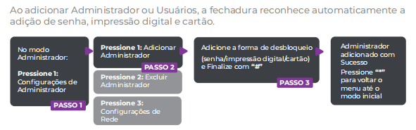 4. Cadastre a forma de desbloqueio (senha/digital/cartão) e finalize com `#`.
