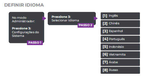 * **Selecionar Idioma:** Menu `3` -> `3`.