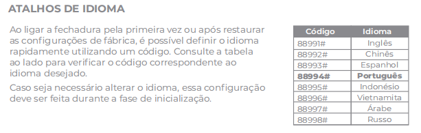 Ao ligar a fechadura pela primeira vez, utilize um código para definir o idioma.