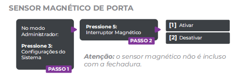 * **Sensor Magnético:** Menu `3` -> `5`. (Atenção: sensor não incluso).