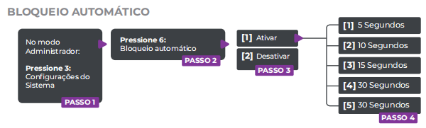 * **Bloqueio Automático:** Menu `3` -> `6`.